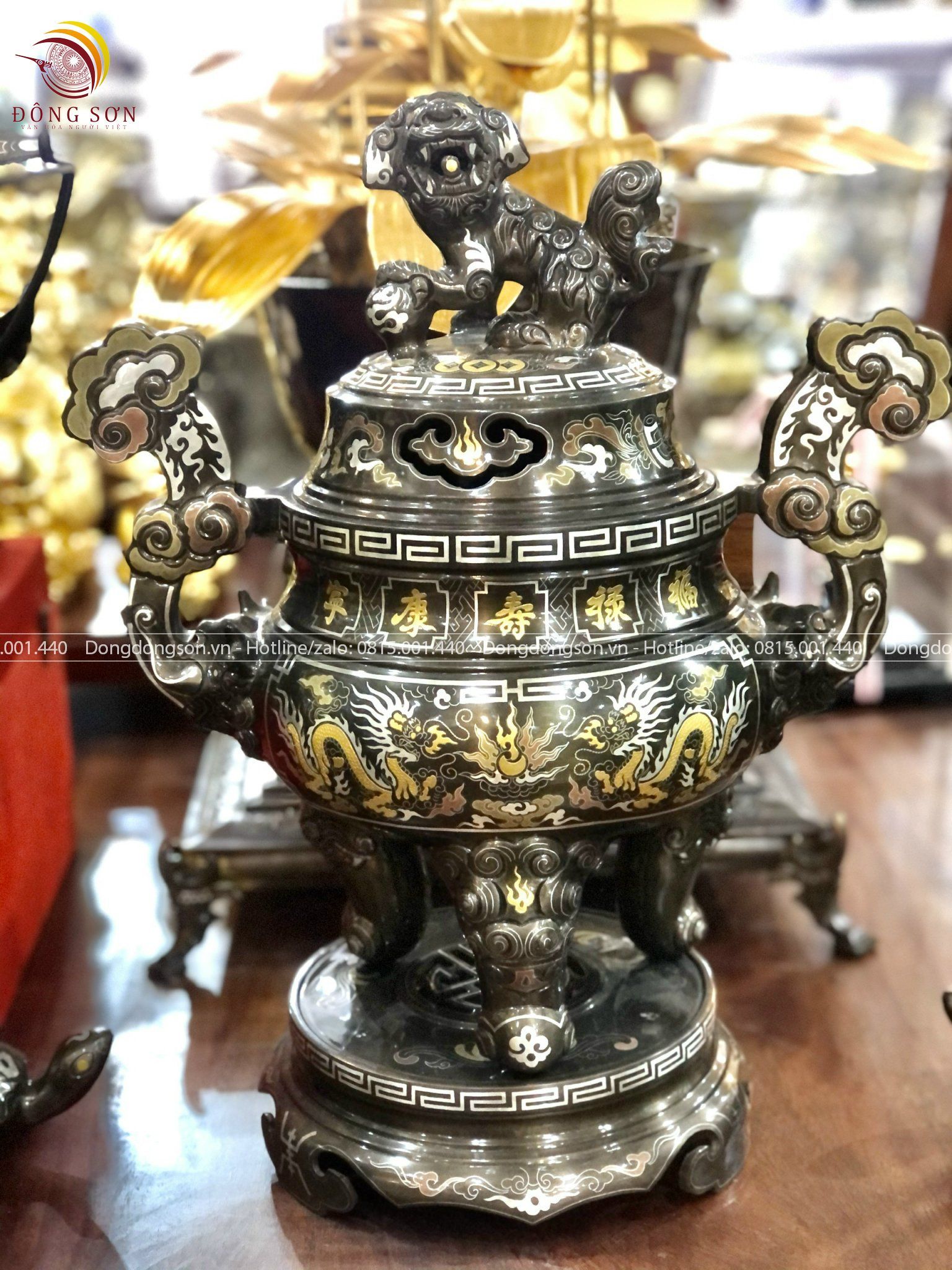 Bộ ngũ sự bằng đồng đỏ khảm ngũ sắc họa tiết rồng | bộ đỉnh đồng ngũ sắc đầy đủ kích cỡ