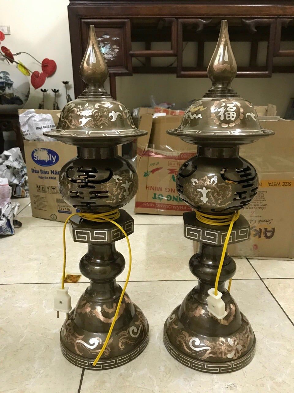 Đôi đèn sen dứa đồng đỏ khảm tam khí cao 55cm mẫu 2 - Đồ thờ bằng đồng đẹp