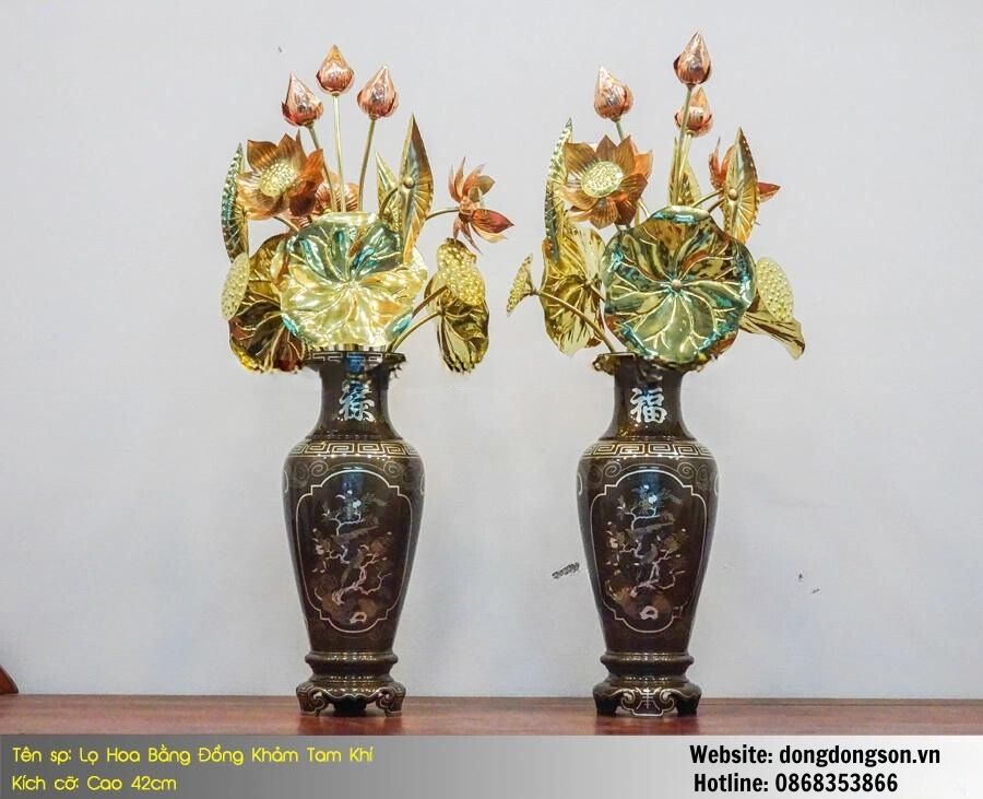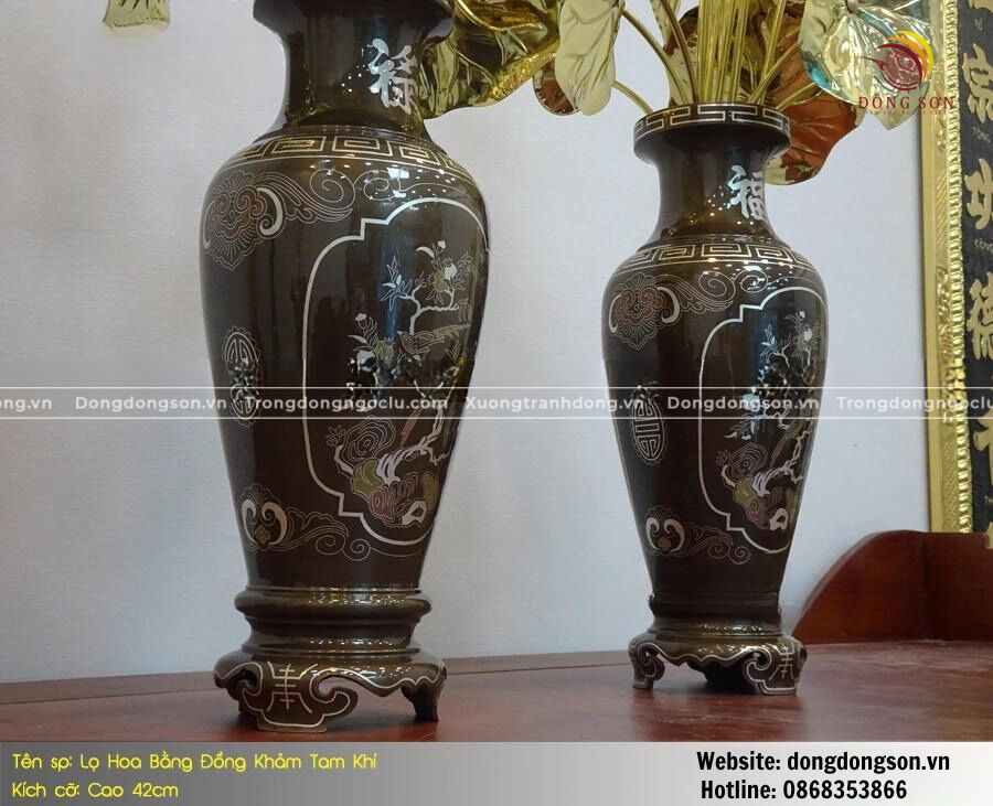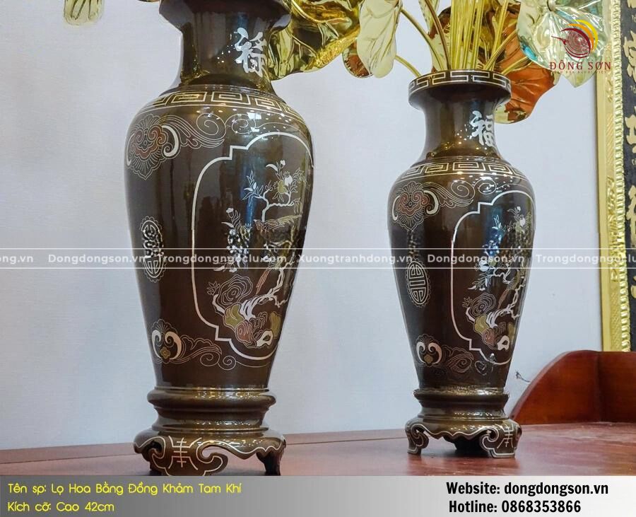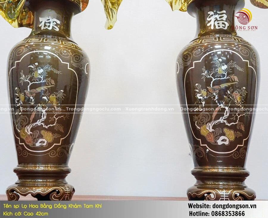 MẪU LỌ HOA BẰNG ĐỒNG KHẢM TAM KHÍ KÍCH THƯỚC 42CM