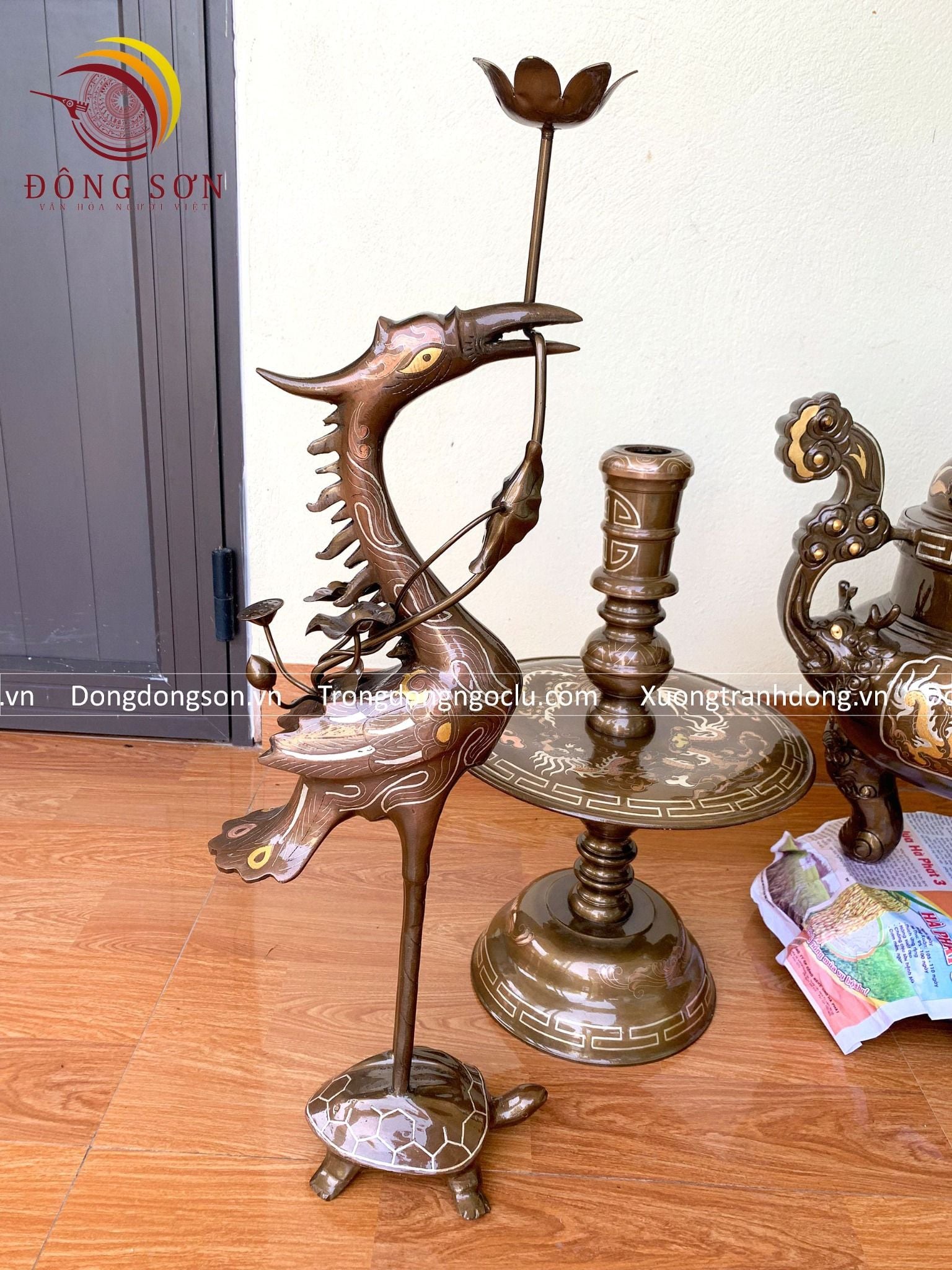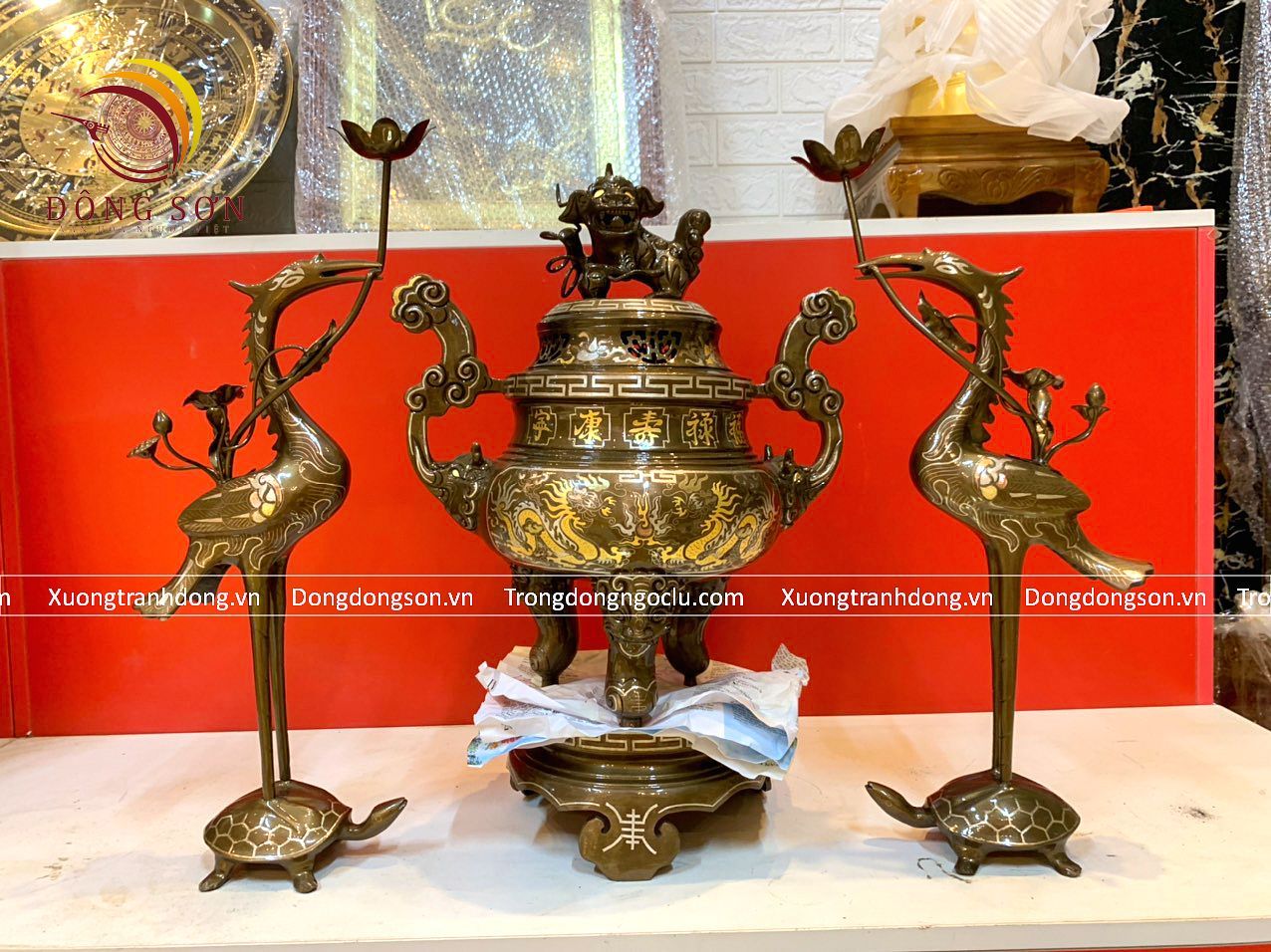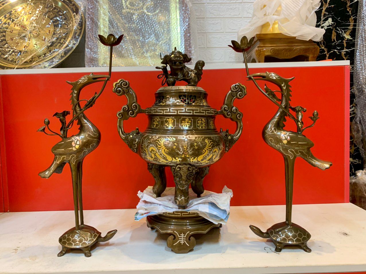 Tam sự hạc song long chầu nguyệt đồng đỏ khảm tam khí dát vàng cao 60cm - bộ đồ thờ cúng