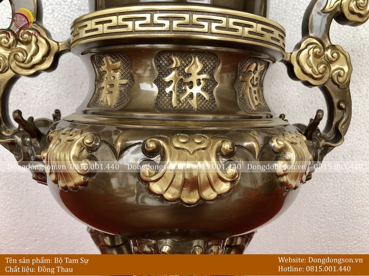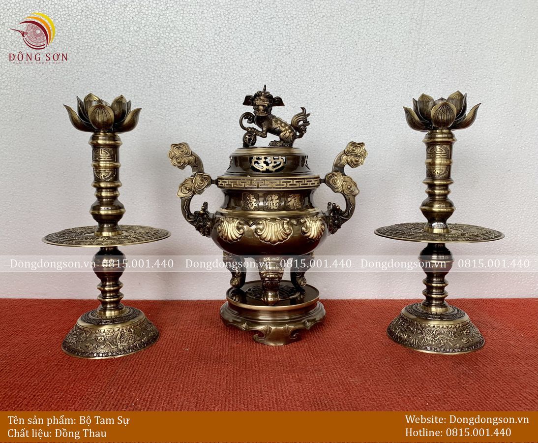 Tam sự nến đồng thau 40cm hoa sòi hun nâu