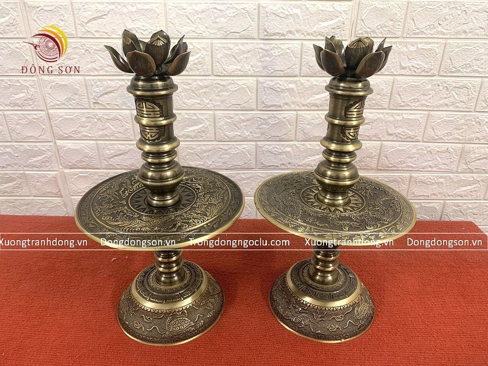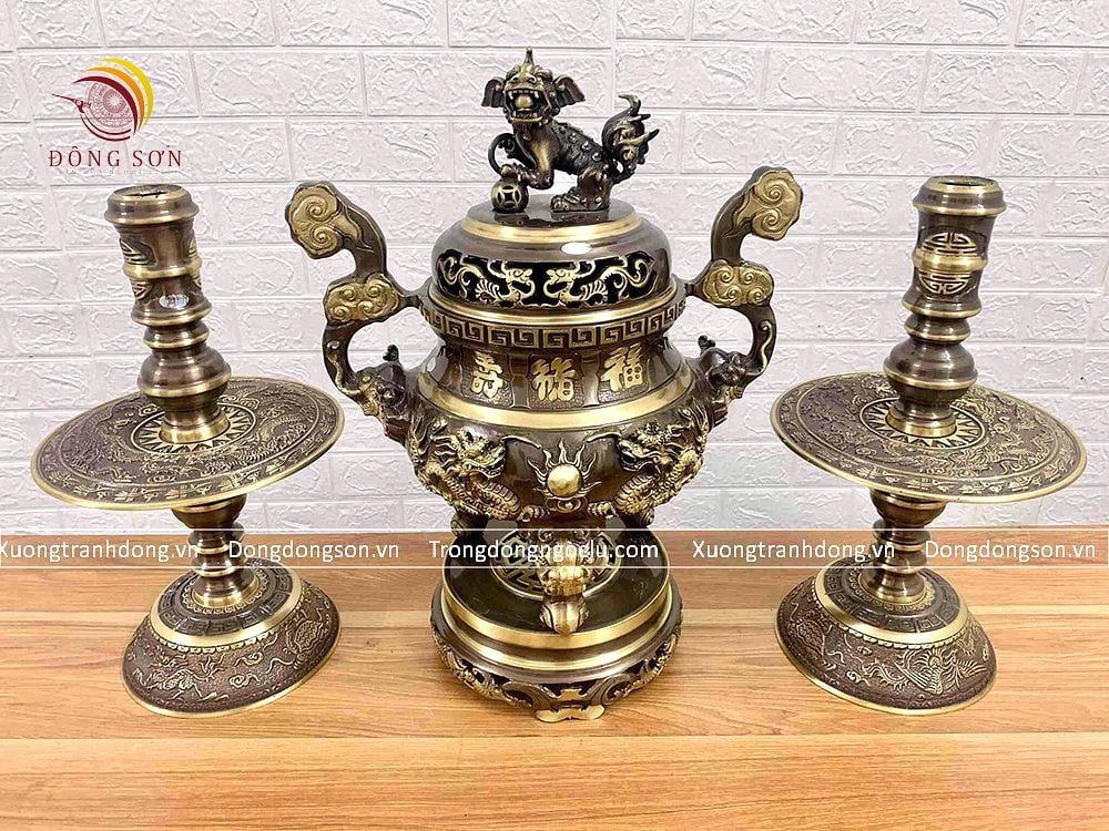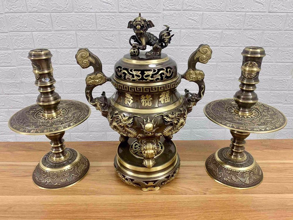 Tam sự nến song long chầu nguyệt đồng vàng màu hun nâu cao 40cm- bộ đồ thờ cúng