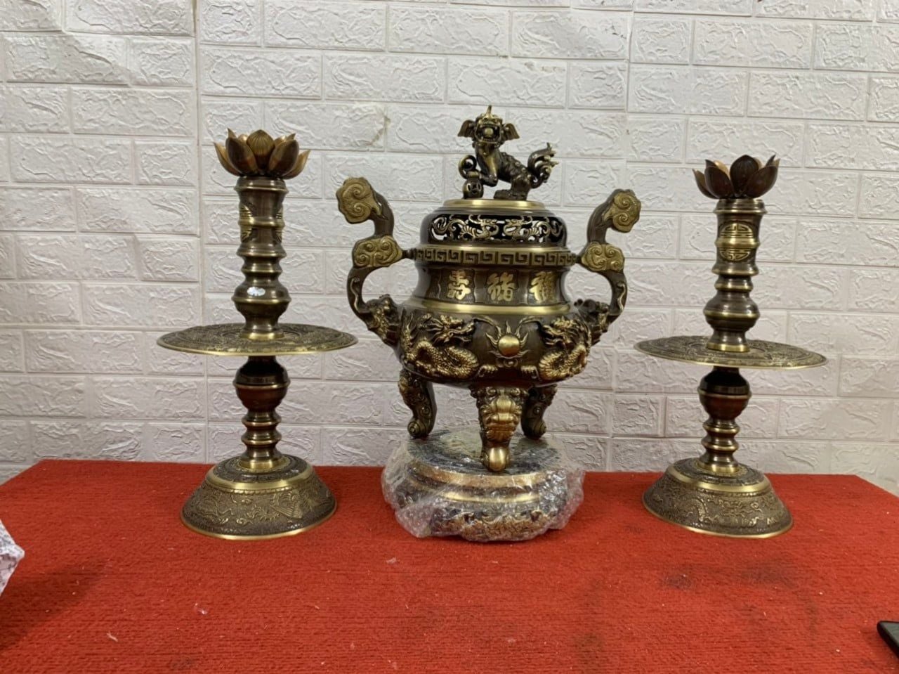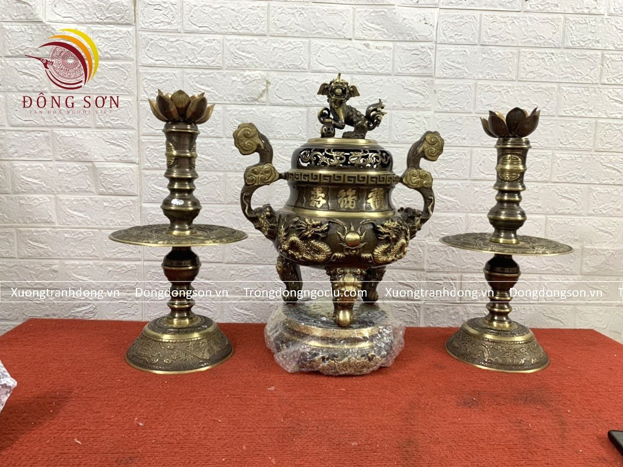 Tam sự nến song long chầu nguyệt đồng vàng màu hun nâu cao 50cm- bộ đồ thờ cúng