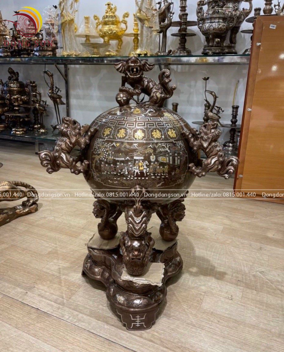 Đỉnh thất lân vờn cầu bằng đồng đỏ khảm ngũ sắc | đỉnh đồng thất lân vờn cầu ngũ sắc đủ kích cỡ