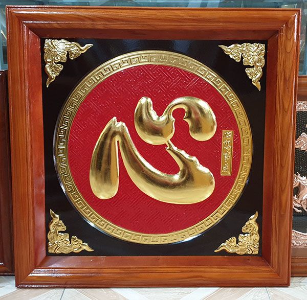 Tranh chữ Tâm hán bằng đồng dát vàng viền khung giả cổ