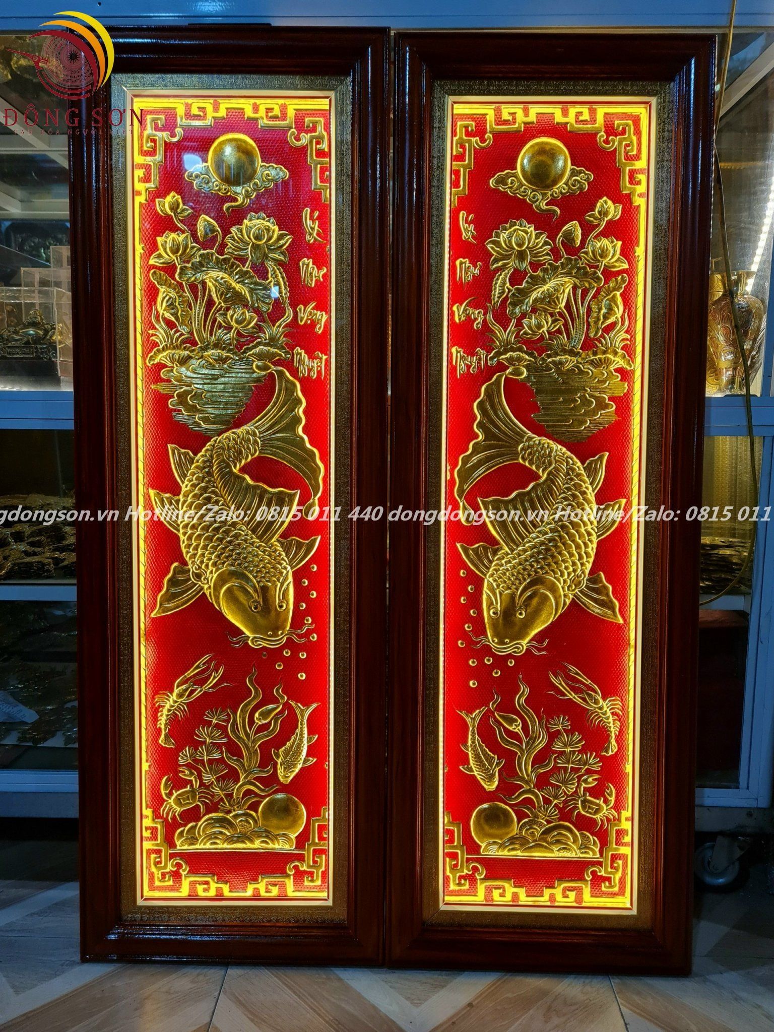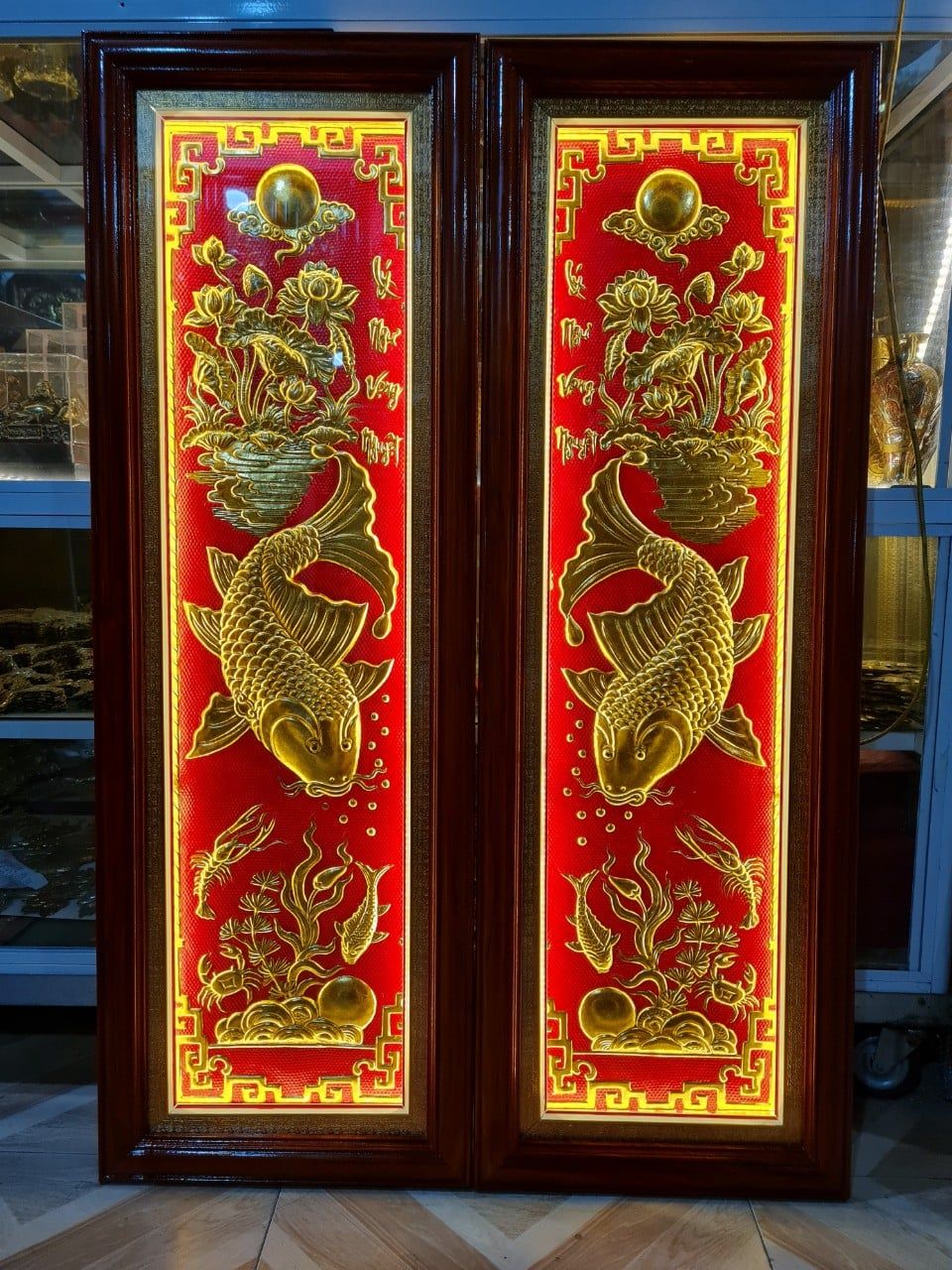 Bức lý ngư vọng nguyệt mạ vàng thúc tay treo tại GĐ chị Hoa - Quảng Ninh