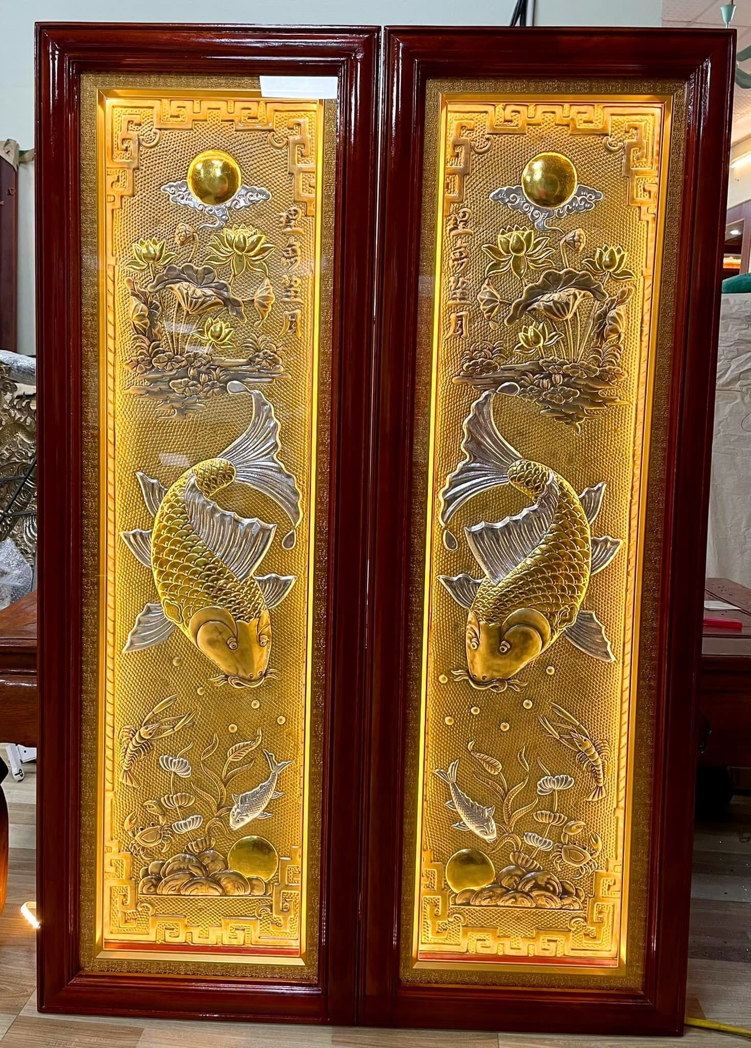 Bức lý ngư vọng nguyệt mạ vàng thúc tay treo tại GĐ chị Hoa - Quảng Ninh