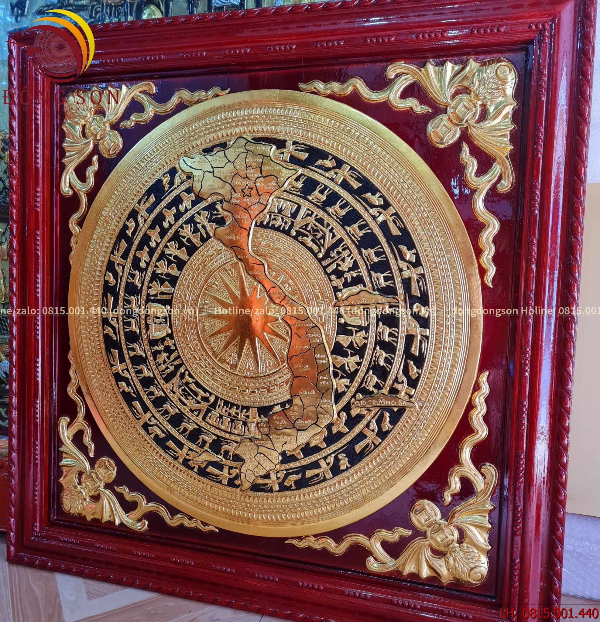 Tranh trống đồng đông sơn thúc nổi dát vàng 14k vẽ nền đen | tranh trống đồng KT 80x80cm