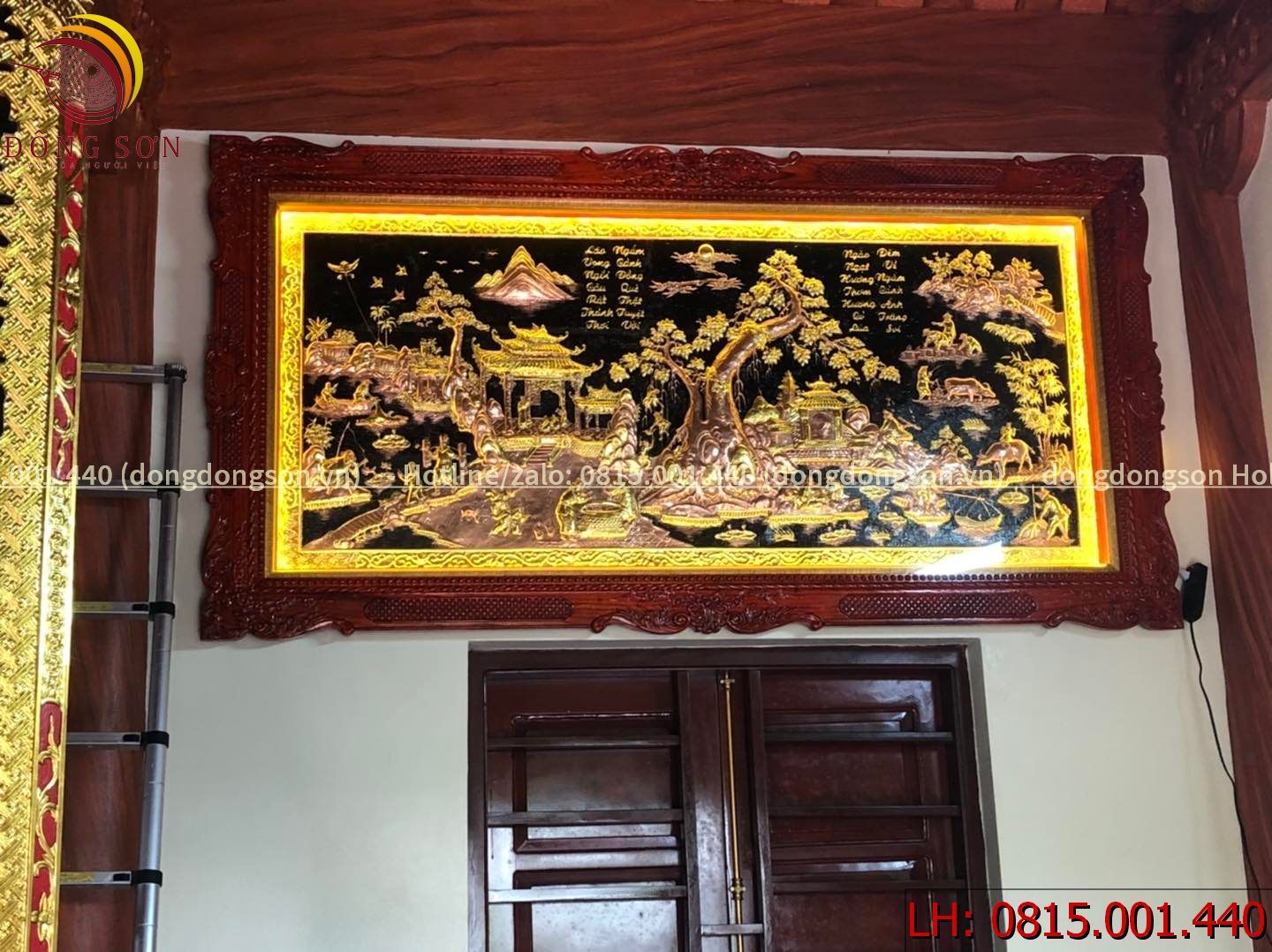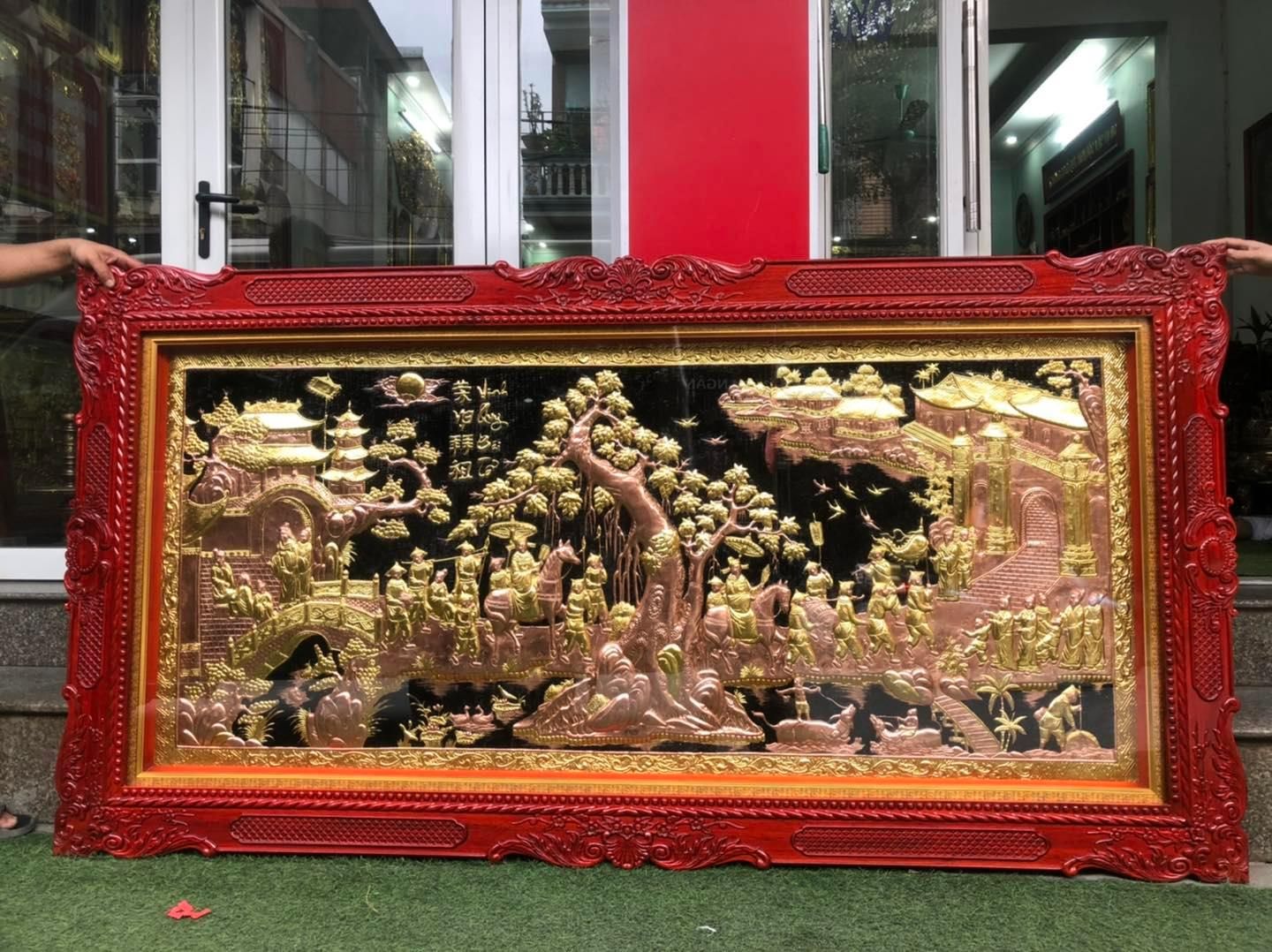 Tranh vinh quy bái tổ bằng đồng đỏ dát vàng bạc KT 230x120cm